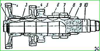 Проміжний вал коробки передач у зборі: 1 - замкове кільце; 2 – шестерня постійного зачеплення; 3 – розпірна втулка; 4 – шестерня четвертої передачі; 5 – шестерня третьої передачі; 6 – шестерня заднього моста; 7 - шестерня другої передачі; 8 - шпонка; 9 - зубчастий вінець першої передачі; 10 - вал