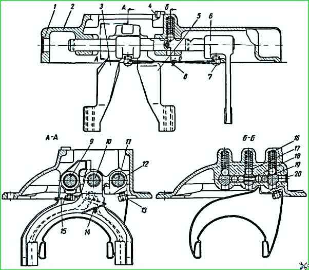 Кришка коробки передач у зборі: 1 та 20 - заглушки; 2 - кришка, 3 - вилка четвертої та п'ятої передач; 4 - настановна втулка; 5 - вилка другої та третьої передач; 6 - вилка першої передачі - заднього ходу; 7 - сапун; 8, 13 і 15 - шплінтовий дріт; 9 - шток вилки перемикання другої та третьої передач; 10 - шток вилки перемикання четвертої та п'ятої передач, 11 - шток вилки перемикання першої передачі та заднього ходу; 12 - головка штока вилки перемикання першої передачі - заднього ходу; 14 - стопорні болти, 16 - пружина фіксатора, 17 - фіксаторна кулька; 18 - штифт замка штоків, 19 - кулька замка штока