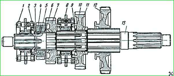 Вторинний вал у зборі: 1 - синхронізатор четвертої та п'ятої передач; 2 та 9 - замкові кільця; 3, 6 і 10 - наполегливі шайби, 4 - шестерня четвертої передачі, 5 - втулка шестерні четвертої передачі; 7 – шестерня третьої передачі; 8 - синхронізатор другої та третьої передач; 11 - шестерня другої передачі; 12 – шестерня першої передачі; 13 - вторинний вал, блок шестерень, два роликові підшипники та розпірна втулка