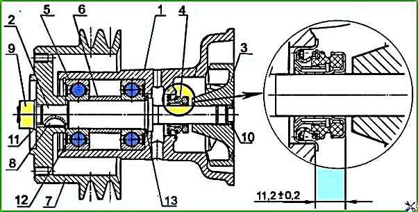 За допомогою зйомника зніміть шків 7 водяного насоса, вийміть шпонку 8.