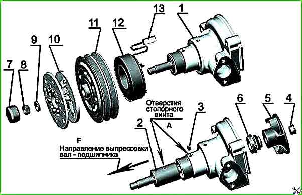 Випресуйте вал з підшипниками з корпусу водяного насоса. Напрямок випресування - у бік встановлення шківа.