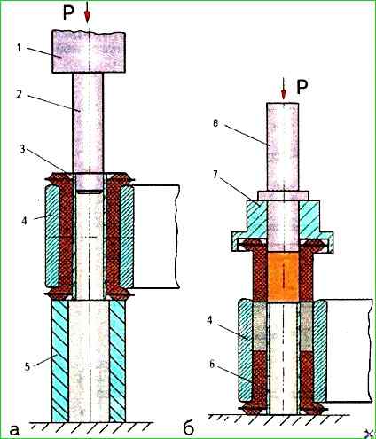 При виявленні вищезгаданих дефектів їх слід замінити (рис.4), випресувавши з вушка ресори за допомогою спеціальної оправки, показаної на рис.5.