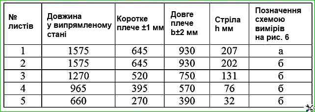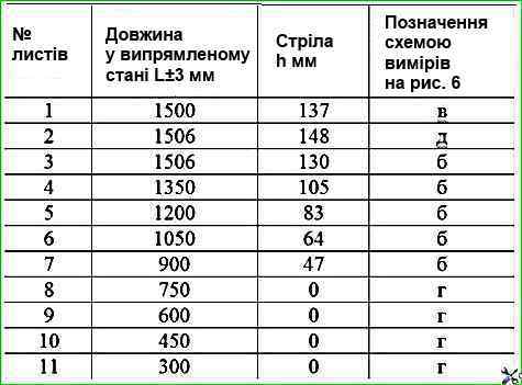 Розміри листів дано на рис. 6 та в табл.1 та 2.