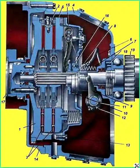 Вращением вилки в необходимом направлении изменить длину тяги 17 для увеличения или уменьшения зазора между торцами упорного кольца и подшипника муфты выключения сцепления.