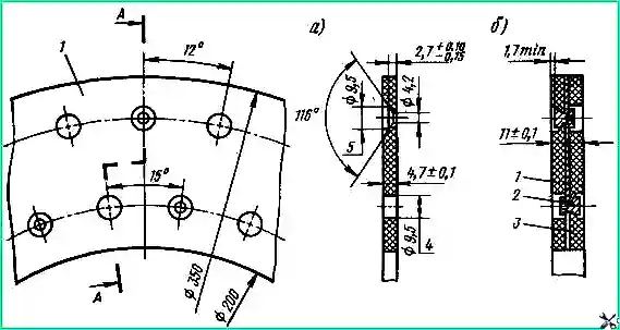 - - изношенные ролики игольчатых подшипников. Размеры новых фрикционных накладок и отверстий в них под заклепки должны соответствовать приведенным на рис. 4.