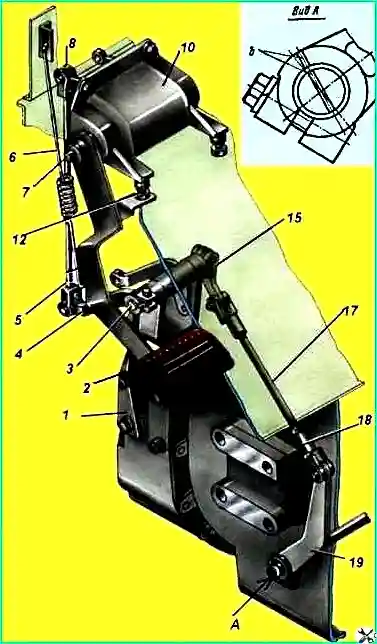Для регулировки свободного хода педали сцепления отсоединить тягу 17 от рычага 19. Ослабить затяжку контргайки вилки тяги.