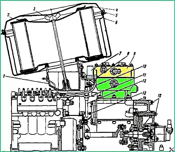 Отвернуть четыре болта 15 крепления компрессора к крышке 14 распределительных шестерен.