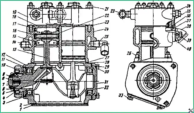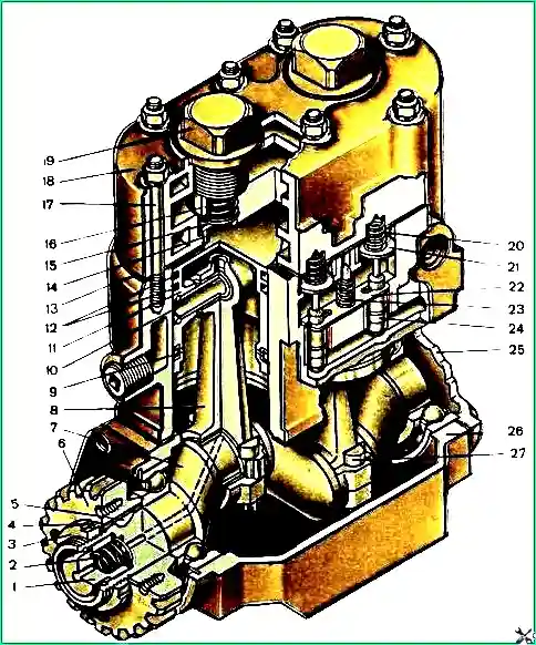 Компрессор автомобиля Урал: 1 - уплотнитель, 2 - пружина уплотнителя, 3 - гайка крепления шестерни, 4 - замочная шайба, 5 - сегментная шпонка, 6 - шестерня привода, 7 - коленчатый вал, 8 - шатун, 9 - маслосъемное кольцо, 10 - поршневые пальцы, 11 - поршни, 12 - компрессионные кольца, 13 - прокладка головки, 14 - седло нагнетательного клапана, 15 - нагнетательный клапан,16 - пружина нагнетательного клапана, 17 - шпилька головки блока, 18 - головка блока, 19 - пробка нагнетательного клапана, 20 - пружина впускного клапана, 21 - впускной клапан, 22 - коромысло, 23 - пружина коромысла, 24 - плунжер со штоком, 25 - крышка, 26 -картер, 27 - шатунный болт