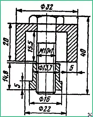 В случае необходимости с помощью съемника (рис. 5) выпрессовать направляющие 37 впускных клапанов (см. рис. 3).