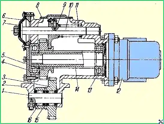 Коробка отбора мощности с насосом: 1 - ось ведущей шестерни; 2 - картер; 3 - шестерня ведущая; 4 - крышка картера; 5 - шестерня ведомого вала; 6 - диафрагма камеры включения; 7 - крышка камеры включения; 8 - крышка; 9 - вилка; 10 - шток вилки включения; 11 - пружина; 12 - насос; 13 - шарикоподшипники; 14 - вал ведомый; 15 - кольцо распорное подшипников