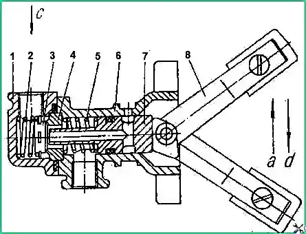 Кран пневматический: 1 - крышка, 2 - пружина клапана, 3 - клапан, 4 - седло клапана, 5 - пружина, 6 - корпус, 7 - шток клапана, 8 - рычаг, а - выключатель, d - включено, c - подвод воздуха