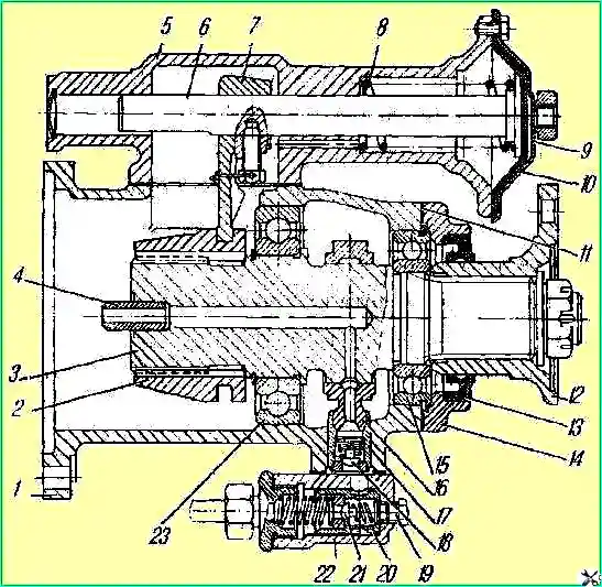 Коробка дополнительного отбора мощности: 1 - корпус; 2 - муфта; 3 - вал; 4 - втулка вала; 5 - корпус камеры включения; 6 - шток включения; 7 - вилка; 8 - пружина; 9 крышка; 10 - диафрагма; 11 -.прокладка; 12 - фланец; 13 - манжета; 14 - крышка; 15, 23 - шарикоподшипники; 16 - шатун насоса; 17 - поршень; 18, 21 - клапаны насоса; 19 - заглушка; 20 - клапан предохранительный; 22 - корпус клапана