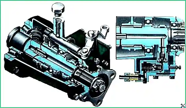 Через отверстие в штоке камера включения коробки сообщается с атмосферой, воздух из камеры выпускается, и пружина выключает коробку.