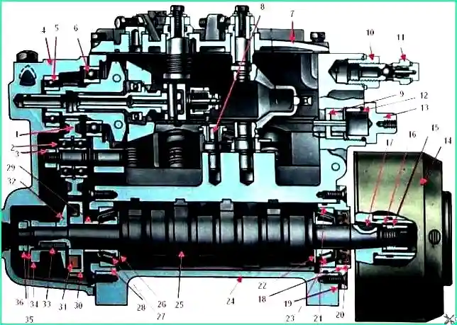 Продольный разрез топливного насоса высокого давления: 1 - промежуточная шестерня регулятора; 2, 6 - шарикоподшипники; 3, 36 - гайки; 4 - задняя крышка регулятора; 7 - верхняя крышка регулятора; 8 - ось рычага реек; 9 - втулка рейки; 10 - ввертыш корпуса насоса; 11 - перепускной клапан; 12, 21 - уплотнительные кольца; 13 - пробка рейки; 14 - муфта опережения впрыска топлива; 15 - кольцевая гайка; 16, 22, 26 - шайбы; 11, 33 - шпонки; 18 - передняя крышка подшипника; 19 - регулировочные прокладки; 20 - манжета; 23, 27 - конические роликоподшипники; 24 - корпус; 25 - кулачковый вал; 28 - задняя крышка подшипника; 29 - упорная втулка ведущей шестерни; 30 - ведущая шестерня регулятора; 31 - сухарь; 32 – фланец; 34 - эксцентрик топливного насоса; 35 - стопорная шайба