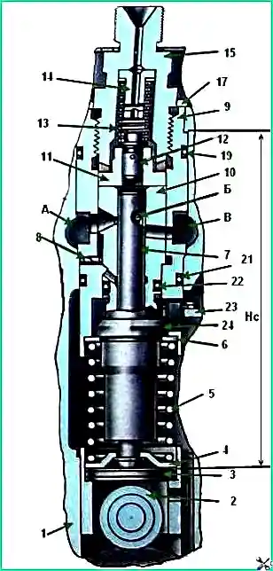 Секция топливного насоса высокого давления: 1 - корпус насоса; 2 - толкатель; 3 - пята толкателя; 4 - тарелка пружины толкателя; 5 - пружина толкателя; 6 - шайба; 7 - плунжер; 8 - штифт; 9 - корпус насосной секции; 10 - втулка плунжера; 11 - корпус нагнетательного клапана; 12 - нагнетательный клапан; 13 - пружина нагнетательного клапана; 14 - упор пружины; 15 - штуцер; 16 - регулировочные шайбы; 17 - стопорная шайба штуцера; 18 - фланец; 19,21 и 22 - уплотнительные кольца; 20 - прокладка нагнетательного клапана; 23 - левая рейка; 24 - поворотная втулка; А - полость нагнетания топлива; Б - винтовая канавка плунжера; В -полость слива топлива; Hc - размер, замеряемый в момент закрытия торцом плунжера отверстия в полость