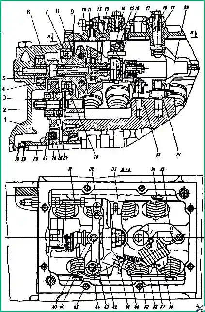 Поперечный разрез топливного насоса высокого давления: 1 - корпус; 2 - ролик толкателя; 3 - ось ролика; 4 - втулка ролика; 5 - пята толкателя; 6 - сухарь; 7 - тарелка пружины толкателя; 8 - пружина толкателя; 9 - шайба; 10 - поворотная втулка; 11 - плунжер; 12,13 - уплотнительные кольца; 14 - установочный штифт; 15 - правая рейка; 16 - втулка плунжера; 11 - корпус секции; 18 - прокладки нагнетательного корпуса; 19,22 гайки; 20 - упор пружины нагнетательного клапана; 21 - штуцер; 23 -фланец корпуса секции; 24 - защитный кожух; 25 - ручной топливоподкачивающий насос; 26 - пробка пружины; 27 - прокладка; 28 - корпус насоса низкого давления; 29 - топливоподкачивающий насос низкого давления; 30 - втулка штока; 31 - пружина толкателя; 32 - толкатель; 33 - винт стопорный; 34 - ось ролика; 36 - ролик толкателя