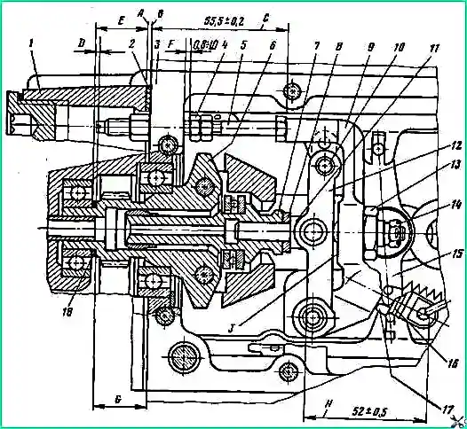 После регулировки гайку 14 законтрить шплинтом. Корпус корректора завернуть в рычаг 9 так, чтобы головка корректора выступала за плоскость «J» на 0,05—0,15 мм.