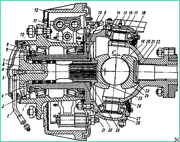 Колесная часть и поворотный кулак: 1 - ступица; 2 - шланг подвода воздуха; 3 - подшипник; 4 - поворотная цапфа; 5 - блок манжет подвода воздуха; 6 - передняя полуось; 7- контргайка; 8 - штифт; 9 - замочная шайба; 10 - внутренняя гайка цапфы; 11 - колесный тормозной цилиндр; 12 - тормозной барабан; 13 - манжета; 14 - разжимная втулка; 15 - пресс-масленка; 16 - рычаг поворотного кулака; 17 - шкворень; 18 - корпус поворотного кулака; 19 - диск шарнира; 20 - шаровая опора; 21 - упорная шайба полуоси; 22, 30 - втулки; 23 - внутренняя полуось; 24 - кулак шарнира; 25 - вилка наружной полуоси; 26 - сальник шаровой опоры в сборе; 27 - регулировочные прокладки; 28 - крышка подшипника; 29 - опорная шайба; 31 - шпилька; а - резьбовое отверстие для съемника полуоси; б - канал в цапфе для подвода воздуха