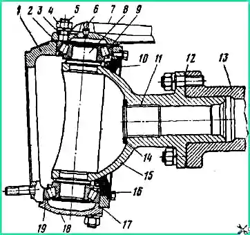 Шаровая опора в сборе: 1 - корпус поворотного кулака; 2, 17- регулировочные прокладки; 3 - разжимная втулка; 4, 5 - гайка и шпилька крепления рычага; 6 - пресс-масленка; 7- рычаг поворотного кулака; 8 - шкворень; 9,19 - конические роликовые подшипники; 10 - сальник шаровой опоры в сборе; 11 - втулка; 12 - уплотнительная прокладка; 13 - кожух полуоси; 14 - упорная шайба полуоси; 15 - шаровая опора: 16 - резиновая заглушка: 18 - крышка подшипника