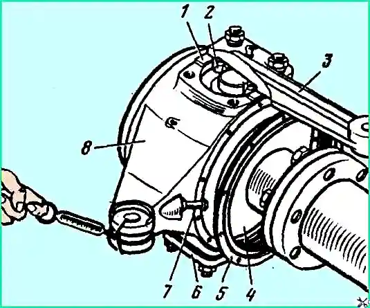 Проверка регулировки подшипников шкворней: 1 - регулировочные прокладки; 2 - конический роликовый подшипник; 3 - рычаг поворотного кулака; 4 - шаровая опора; 5 - крышка сальника; 6 - крышка подшипника; 7 - упорный болт; 8 - корпус поворотного кулака