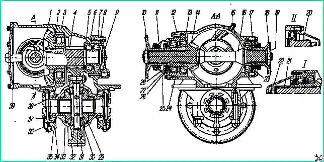Подшипники дифференциала регулируйте гайками 37 (см. рис.1). После затяжки гаек расстояние между крышками подшипников дифференциала должно увеличиться на 004—0,14 мм.