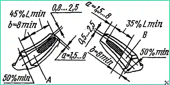 Отпечаток должен располагаться не ближе 5 мм к краям зуба. При этом боковой зазор в зубьях (у широкой части) должен быть 0,1-0,4 мм.