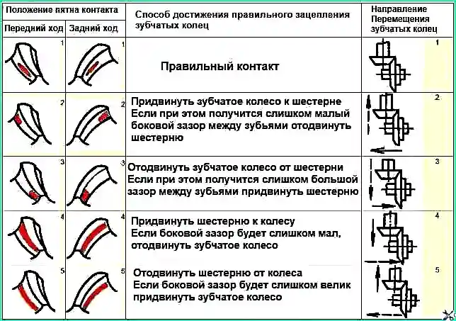 Способы исправления пятна контакта и достижения правильного зацепления шестерен приведены в таблице.
