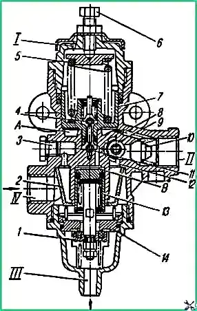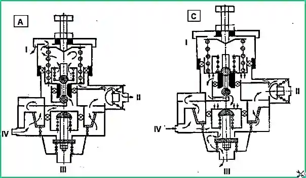 Когда давление в выводе "II" и полости «А» понизится до 637 кПа (65 кгс/см²) поршень 7 под действием пружины 5 перемещается вниз, клапан 11 закрывается, выпускной клапан 4 сообщает полость «В» с атмосферой через вывод "I".
