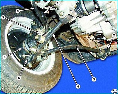 Отверните гайку крепления шарового шарнира рулевой тяги и выпрессуйте палец шарнира из поворотного рычага