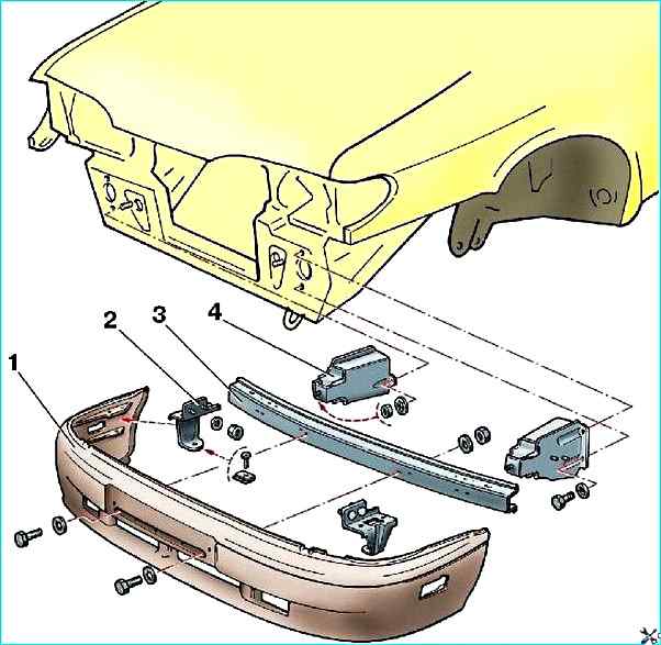 Передний бампер 1 снимается с передка кузова в сборе с балкой 3 и кронштейнами для этого, отверните гайки крепления боковых 2 и передних 4 кронштейнов бампера.