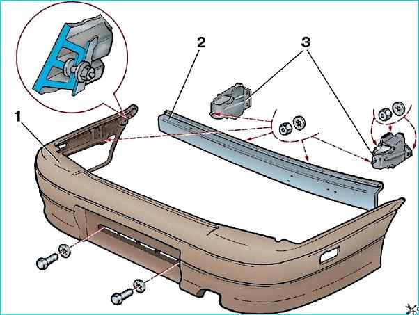 Задний бампер 1 снимается с задка кузова в сборе с балкой 2 и кронштейнами 3.