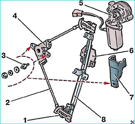 Снимите стеклоподъемник, выкрутите опоры 3 и отсоедините моторедуктор.