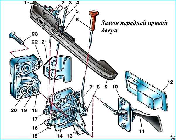 Выверните винты и снимите замок 8. Выньте внутреннюю ручку двери в сборе с кронштейном 10, вывернув предварительно винты крепления.