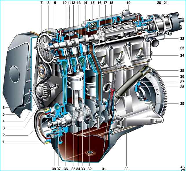 Двигатель ВАЗ-2110: 1 – шкив привода генератора; 2 – масляный насос; 3 – ремень привода механизма газораспределения; 4 – зубчатый шкив насоса охлаждающей жидкости; 5 – передняя крышка привода механизма газораспределения; 6 – натяжной ролик; 7 – зубчатый шкив распределительного вала; 8 – задняя крышка привода распределительного вала; 9 – сальник распределительного вала; 10 – крышка головки блока цилиндров; 11 – распределительный вал; 12 – передняя крышка подшипников распределительного вала; 13 – толкатель; 14 – направляющая втулка клапана; 15 – сетка маслоотделителя системы вентиляции картера; 16 – выпускной клапан; 17 – впускной клапан; 18 – задняя крышка подшипников распределительного вала; 19 – топливный насос; 20 – корпус вспомогательных агрегатов; 21 – датчик-распределитель зажигания; 22 – отводящий патрубок рубашки охлаждения; 23 – головка блока цилиндров; 24 – свеча зажигания; 25 – шланг вентиляции картера; 26 – маховик; 27 – держатель заднего сальника коленчатого вала; 28 – задний сальник коленчатого вала; 29 – блок цилиндров; 30 – поддон картера; 31 – указатель уровня масла (масляный щуп); 32 – коленчатый вал; 33 – поршень; 34 – крышка шатуна; 35 – шатун; 36 – крышка коренного подшипника коленчатого вала; 37 – передний сальник коленчатого вала; 38 – зубчатый шкив коленчатого вала