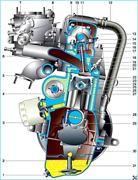 Поперечный разрез двигателя ВАЗ-2110: 1 – пробка сливного отверстия поддона картера; 2 – поддон картера; 3 – масляный фильтр; 4 – насос охлаждающей жидкости; 5 – выпускной коллектор; 6 – впускной коллектор; 7 – карбюратор; 8 – топливный насос; 9 – крышка головки блока цилиндров; 10 – крышка подшипников распределительного вала; 11 – распределительный вал; 12 – шланг вентиляции картера; 13 – регулировочная шайба клапана; 14 – толкатель; 15 – сухари клапана; 16 – пружины клапана; 17 – маслосъемный колпачок; 18 – направляющая втулка клапана; 19 – клапан; 20 – головка блока цилиндров; 21 – свеча зажигания; 22 – поршень; 23 – компрессионные поршневые кольца; 24 – маслосъемное кольцо; 25 – поршневой палец; 26 – блок цилиндров; 27 – шатун; 28 – коленчатый вал; 29 – крышка шатуна; 30 – указатель уровня масла; 31 – приемник масляного насоса
