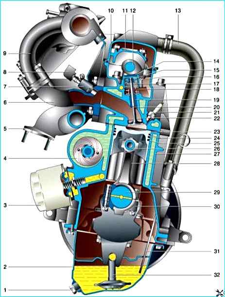 Поперечный разрез двигателя ВАЗ-2111: 1 – пробка сливного отверстия поддона картера; 2 – поддон картера; 3 – масляный фильтр; 4 – насос охлаждающей жидкости; 5 – выпускной коллектор; 6 – впускной коллектор; 7 – форсунка; 8 – топливная рампа; 9 – ресивер; 10 – крышка головки блока цилиндров; 11 – крышка подшипников распределительного вала; 12 – распределительный вал; 13 – шланг вентиляции картера; 14 – регулировочная шайба клапана; 15 – сухари клапана; 16 – толкатель; 17 – пружины клапана; 18 – маслосъемный колпачок; 19 – направляющая втулка клапана; 20 – клапан; 21 – свеча зажигания; 22 – головка блока цилиндров; 23 – поршень; 24 – компрессионные кольца; 25 – маслосъемное кольцо; 26 – поршневой палец; 27 – блок цилиндров; 28 – шатун; 29 – коленчатый вал; 30 – крышка шатуна; 31 – указатель уровня масла; 32 – приемник масляного насоса