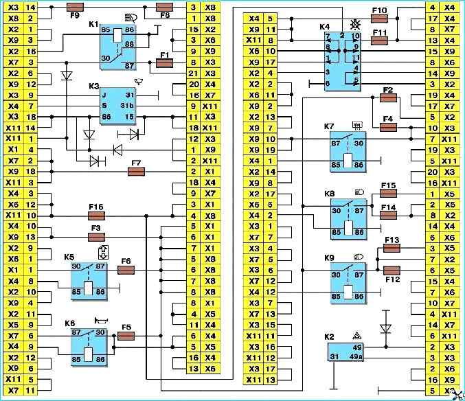 Большинство предохранителей и вспомогательных реле находится в отдельном монтажном блоке ( рис. 3), установленном в коробке воздухопритока с левой стороны автомобиля.