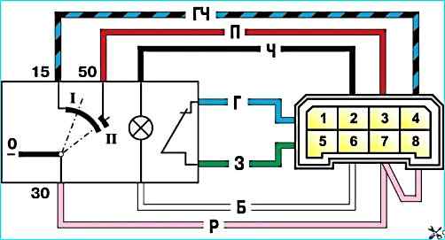 Контакты микровыключателя должны быть разомкнуты при извлеченном ключе в положении О (выключено) и замкнуты при вставленном ключе во всех положениях.