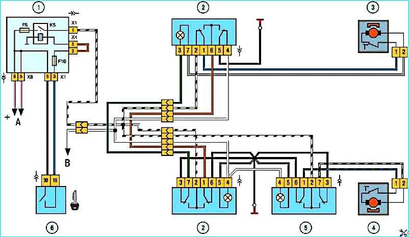Напряжение питания подается к переключателям при включении зажигания через предохранитель F6 и реле электростеклоподъемников К5, расположенные в монтажном блоке 1