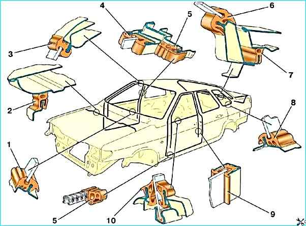 После замены отдельных деталей кузова промажьте сварные швы с обеих сторон пластизолем д-4А и нанесите невысыхающую мастику типа 51-Г-7 в угловые стыки и зазоры, показанные на рисунке.