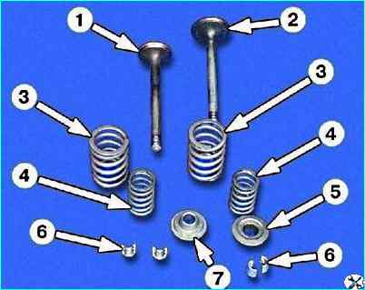 Детали привода клапана: 1 — выпускной клапан 2— впускной клапан 3 — наружная пружина 4— внутренняя пружина 5— тарелка пружин 6— сухари 7— опорная шайба пружин