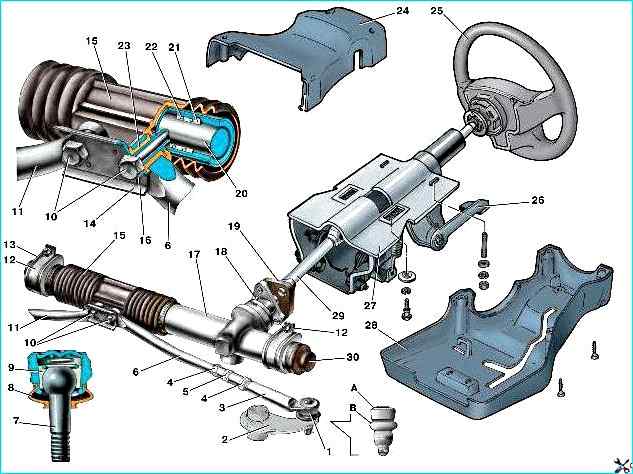 Рулевое управление: 1 - шаровой шарнир наконечника рулевой тяги; 2 - поворотный рычаг; 3 - наконечник рулевой тяги; 4 - контргайка; 5 - тяга; 6,11 - внутренние наконечники рулевых тяг; 7 - палец шарового шарнира; 8 - защитный колпачок; 9 - вкладыш шарового пальца; 10 - болты крепления рулевых тяг к рейке; 12 - скоба крепления рулевого механизма; 13 - опора рулевого механизма; 14 - соединительная пластина; 15 - защитный чехол; 16 - стопорная пластина; 17 - картер рулевого механизма; 18 - стяжной болт; 19 - соединительная эластичная муфта; 20 - рейка; 21 - опорная втулка рейки; 22 - демпфирующее кольцо; 23 - резинометаллический шарнир; 24 - облицовочный кожух (верхняя часть); 25 - рулевое колесо; 26 - рычаг регулировки положения рулевой колонки; 27 - кронштейн крепления вала рулевого управления; 28 - облицовочный кожух (нижняя часть); 29 - промежуточный вал рулевого управления; 30 - защитный колпачок; А - поверхность корпуса шарового шарнира; В - поверхность поворотного рычага