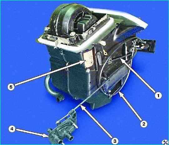 Отверните две гайки крепления с левой стороны (под нижней гайкой закреплен провод «массы» отопителя) и снимите отопитель с панелью управления.