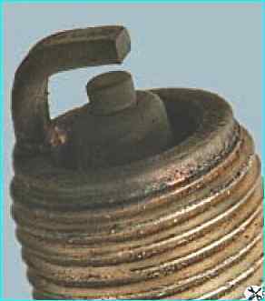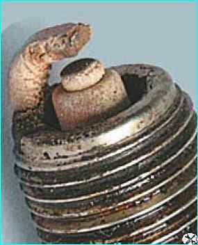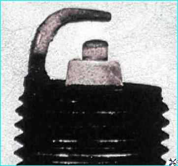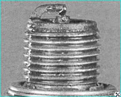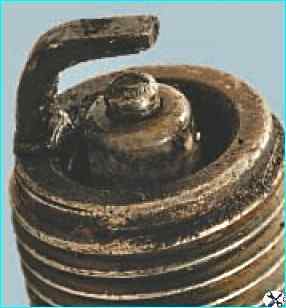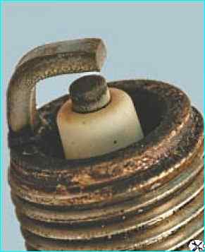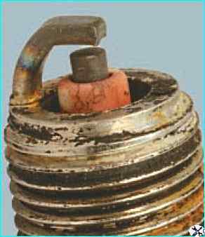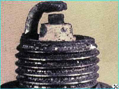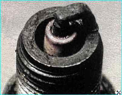 Изолятор белый, но может быть загрязнен из-за пропусков искры и попадающих на него отложений из камеры сгорания.