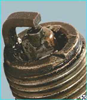 Замасленные электроды и изолятор свечи. Причина — попадание масла в камеру сгорания.