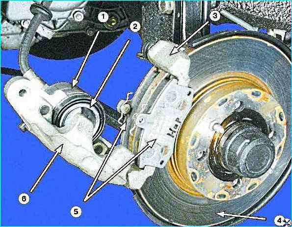 Между блоком цилиндров и суппортом располагаются колодки: внутренняя опирается на поршень цилиндра, внешняя — на прилив суппорта.