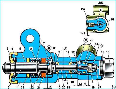 Давление в заднем тормозе будет регулироваться частью регулятора, которая включает в себя поршень 2 с уплотнителем 21 и втулкой 7.