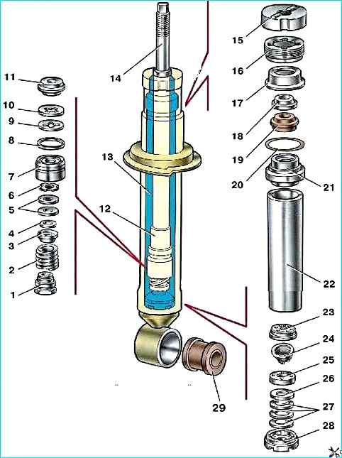 Порядок разборки амортизатора отличается незначительно от последовательности разборки стойки передней подвески, а именно: