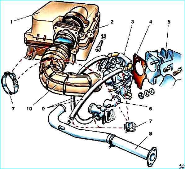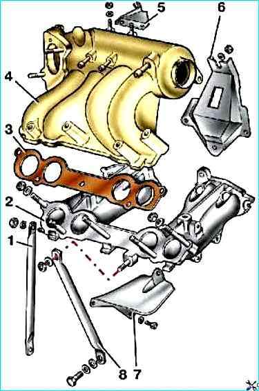 Отвернув гайки и болты крепления, снимите поддерживающий 1 (см. рис. 2) и опорный 8 кронштейны, а затем впускную трубу с кронштейном 6 и экраном 7.