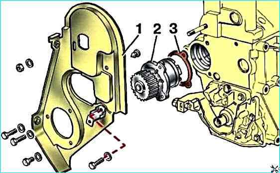 Выньте из гнезда в блоке цилиндров насос охлаждающей жидкости с прокладкой 3.
